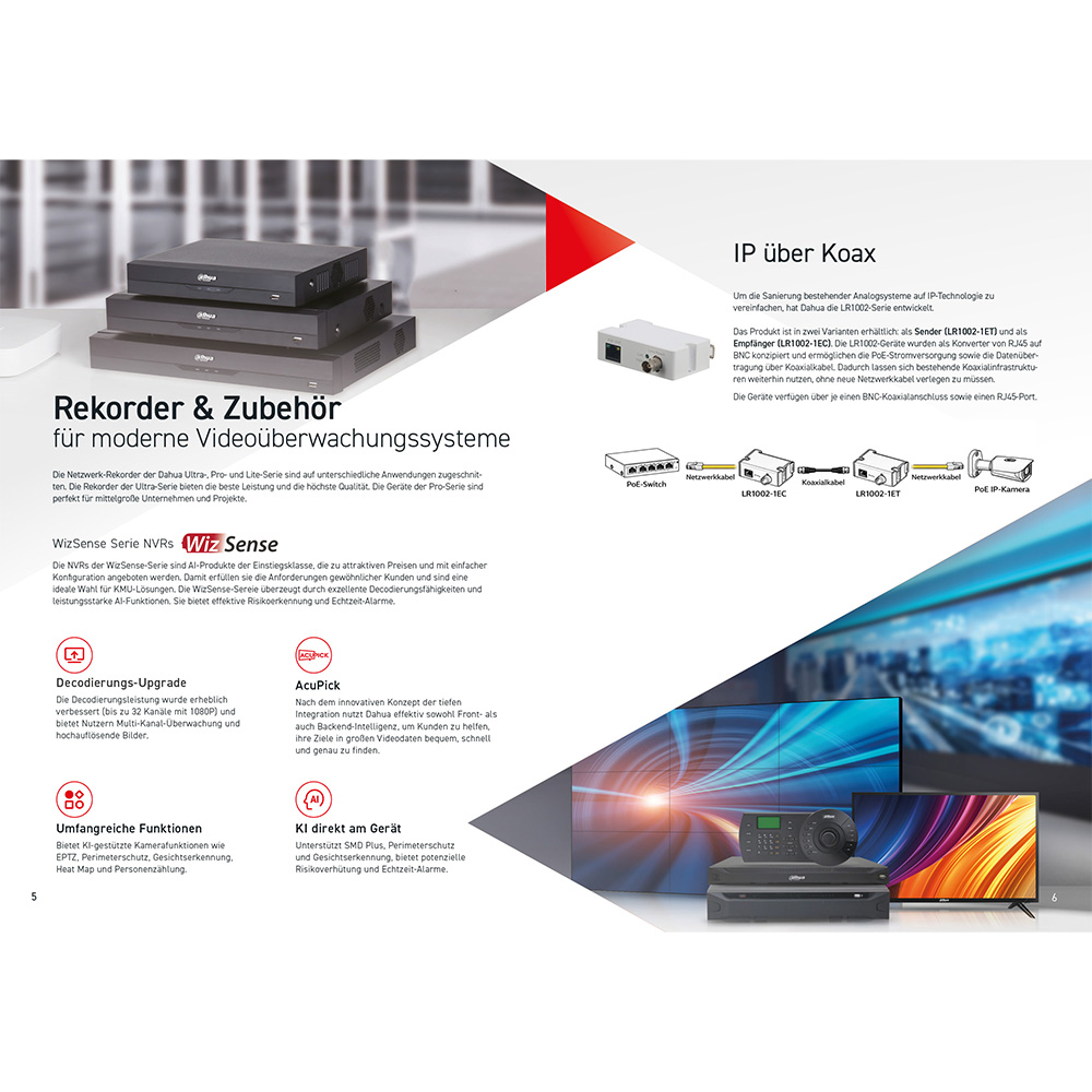 - Umfangreicher Inhalt auf 12 Seiten: Informationen zu intelligenten Produktserien, modernen Rekordern, IP-über-Koax-Lösungen sowie Video-Türsprechanlagen.