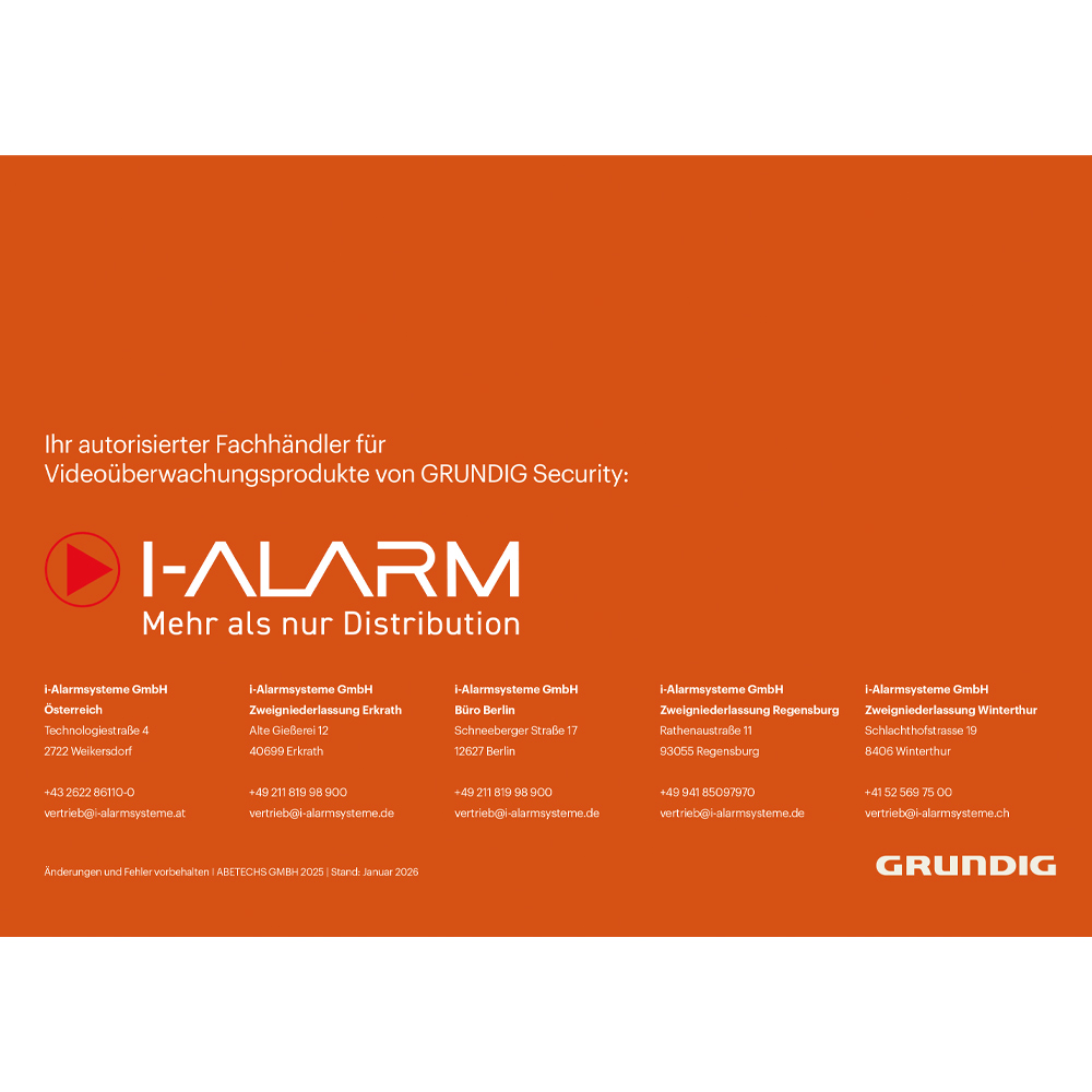 Der GRUNDIG SMART Produktkatalog 2026 bietet auf 24 Seiten eine umfassende Übersicht über die aktuelle SMART-Produktlinie von GRUNDIG. Im Fokus stehen moderne Lösungen für intelligente Videosicherheit, die klassische Überwachung mit leistungsstarker Bildanalyse und KI-gestützten Funktionen verbinden.