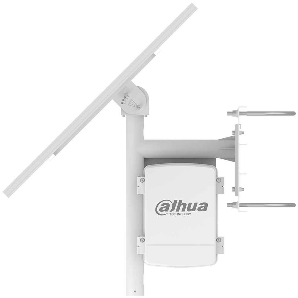 Das System unterstützt bis zu 4 Lithium-Eisenphosphat-Batterien (z. B. DH-PFE320-LP1207), ist mit einer automatischen Heizfunktion für kalte Regionen ausgestattet und bietet Statusanzeigen für System, Solar und Batteriezustand. Eine stabile Befestigung an einem Mast sowie ein verstellbarer Neigungswinkel erleichtern die Ausrichtung zur Sonne.